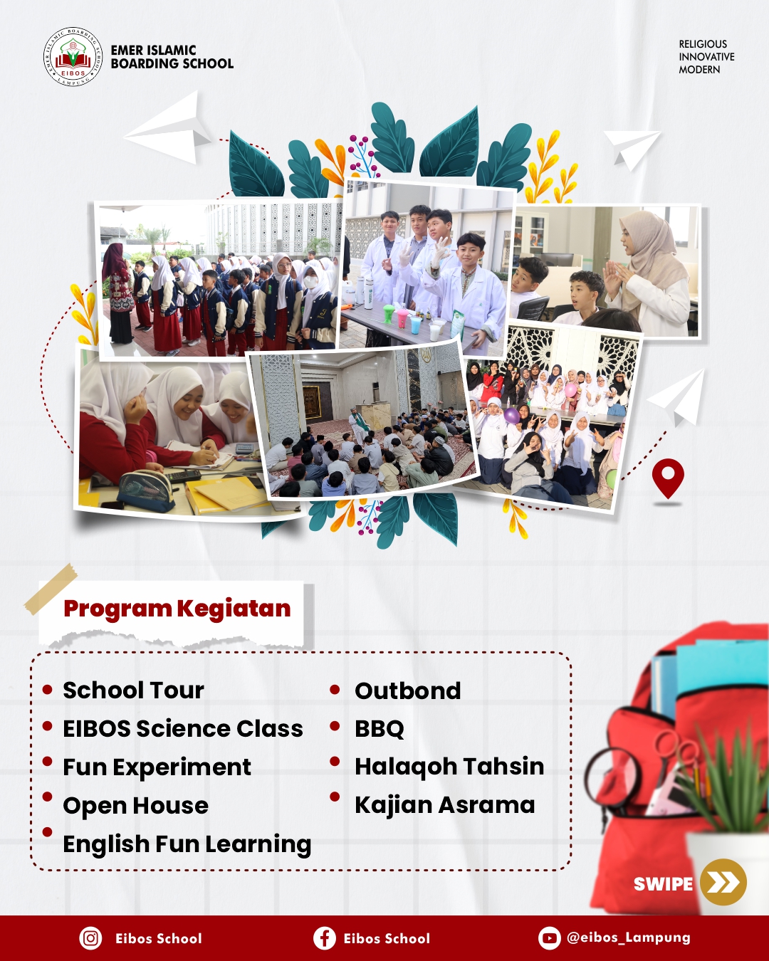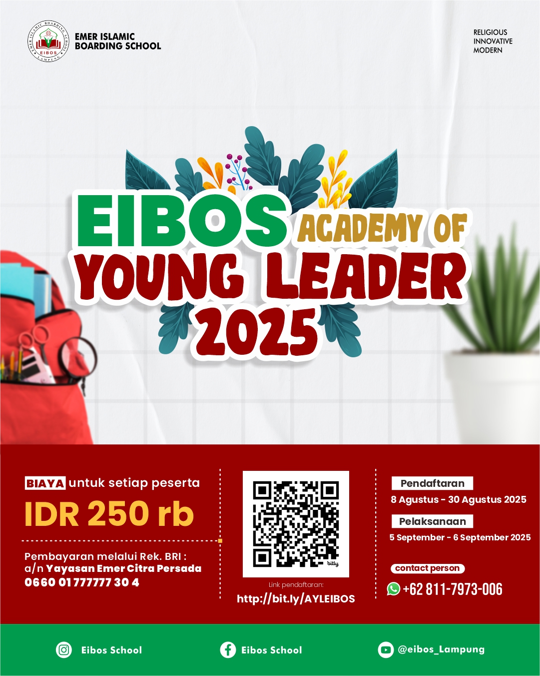 EIBOS – Emer Islamic Boarding School membuka program menarik bagi siswa kelas 5 & 6 SD dan kelas 8 & 9 SMP di seluruh Indonesia yaitu EIBOS Academy of Young Leader (EAYL). Program ini mengajak peserta untuk bisa merasakan menjadi siswa EIBOS selama satu hari penuh.
